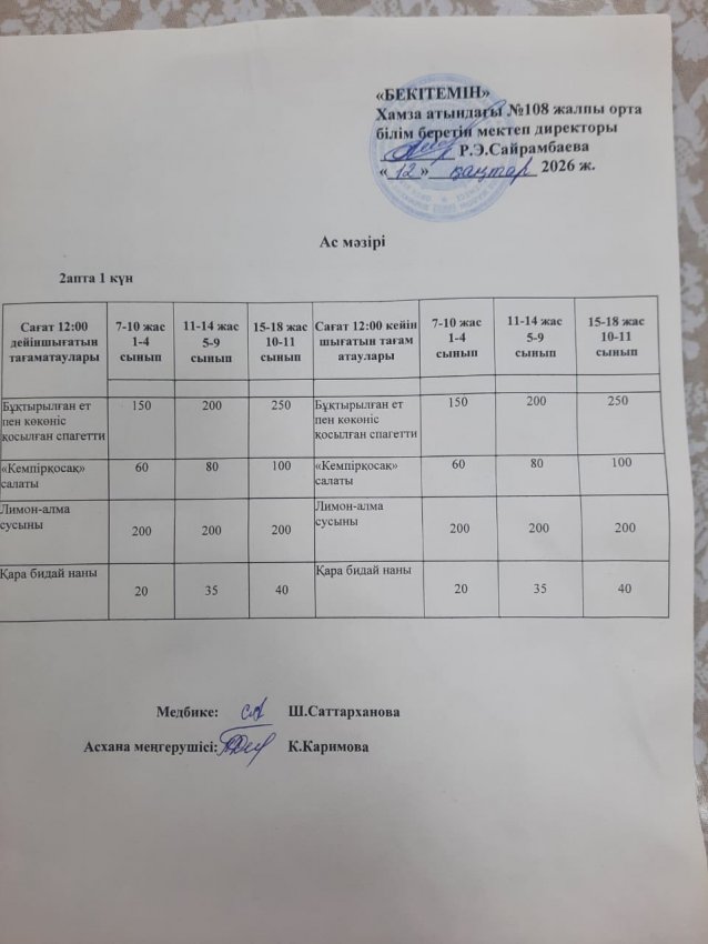 Шымкент қаласы білім басқармасына қарасты Хамза атындағы N•108 ЖОББМ асханасында мемлекет тарапынан тегін ыстық тамақпен қамтылған оқушылар үшін дайындалатын тамақтың сапасы, мектеп асханасының жұмысы, тазалығы бракераждық комиссия тарапынан күн сайын тексеріліп отырылуда.