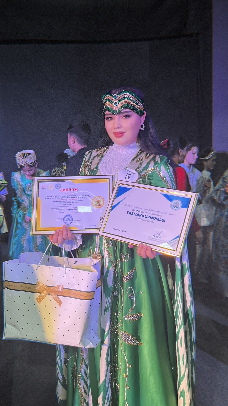 Оқушыны байқауға дайындаған пән мұғалімі: Наргиза Юлдашева. Сонымен қатар, пән мұғалімі «Vatandoshlar» қоғамдық қоры тарапынан сыйлықтарға ие болды.