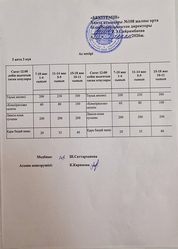 Шымкент қаласы білім басқармасына қарасты Хамза атындағы N•108 ЖОББМ асханасында мемлекет тарапынан тегін ыстық тамақпен қамтылған оқушылар үшін дайындалатын тамақтың сапасы, мектеп асханасының жұмысы, тазалығы бракераждық комиссия тарапынан күн сайын тексеріліп отырылуда.