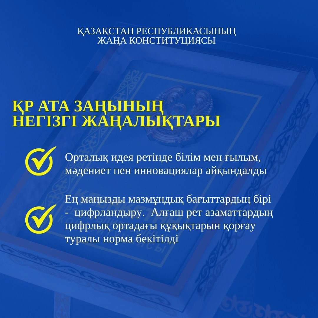 Қазақстан Республикасының жаңа Конституциясында елдің дамуына бағытталған бірқатар маңызды жаңалықтар айқындалды. Ата Заңның мазмұны заманауи талаптарға сәйкес жаңартылып, мемлекеттің стратегиялық басымдықтары нақты көрсетілді.
