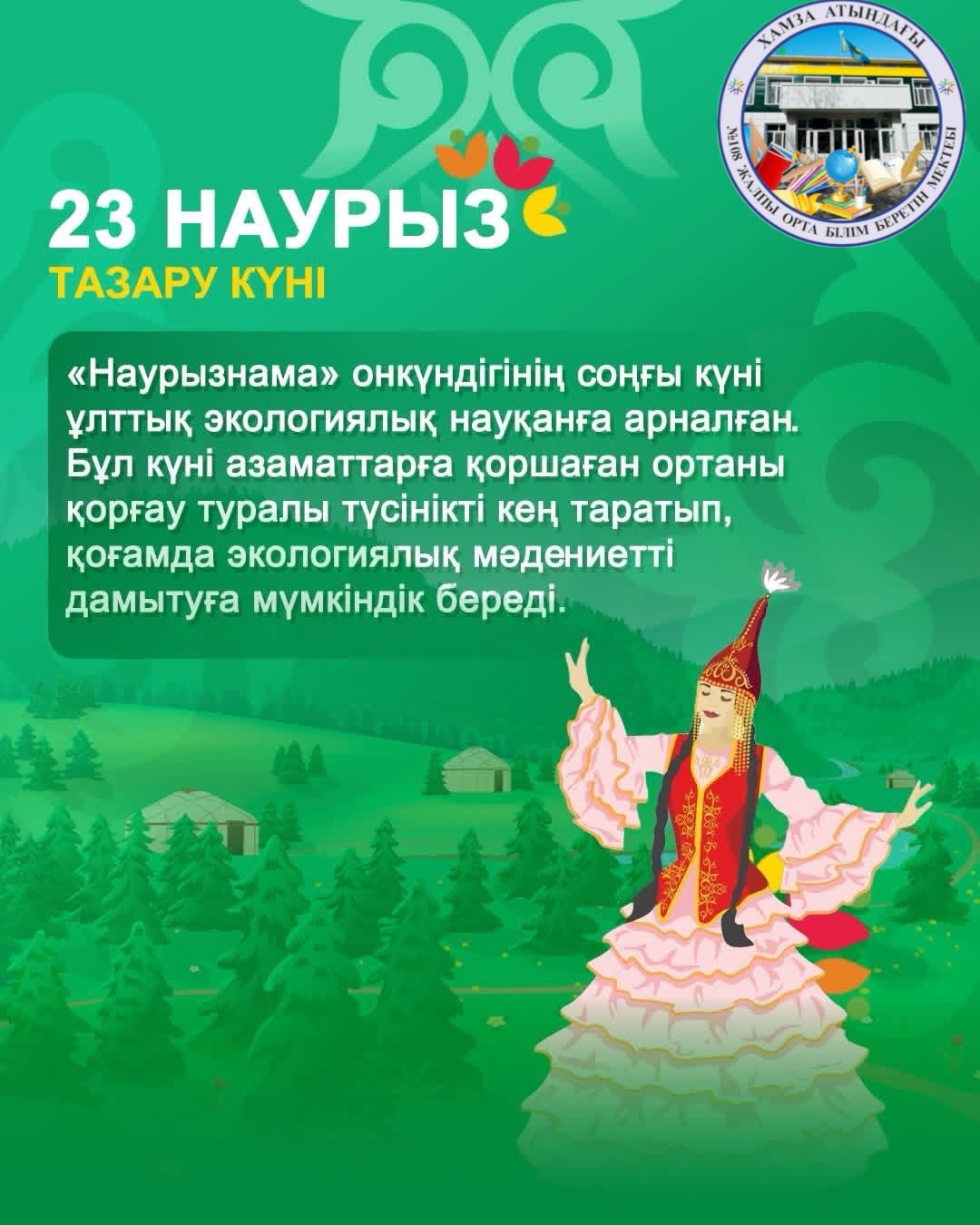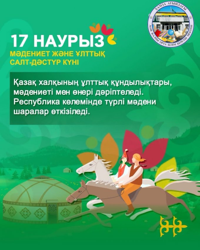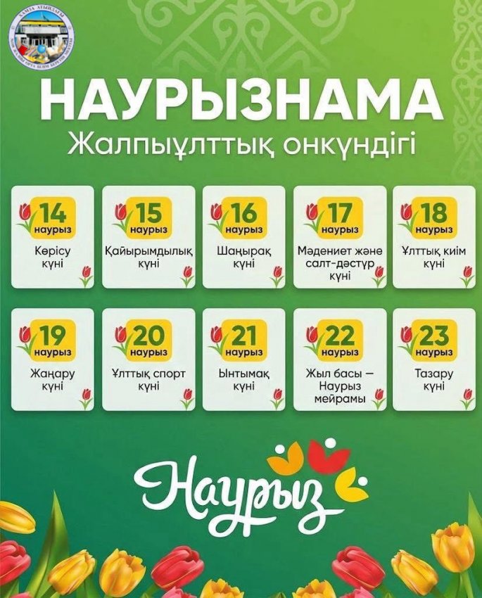 Наурызнаманың әр күні қоғамның түрлі саласына арналып, ұлттық дәстүр мен құндылықтарды дәріптеуге бағытталады. Бұл көпкүндік тойлау дәстүрі халқымыздың мәдени мұрасымен үндеседі.